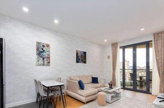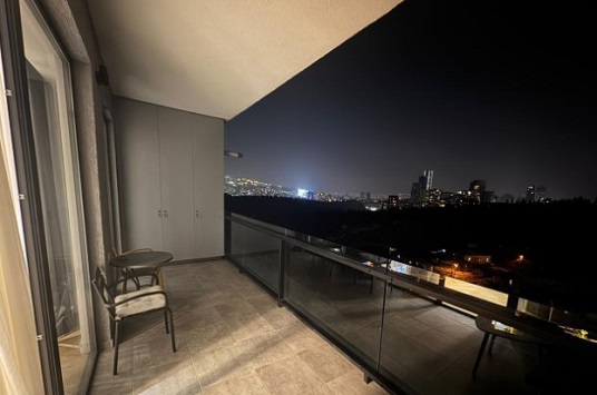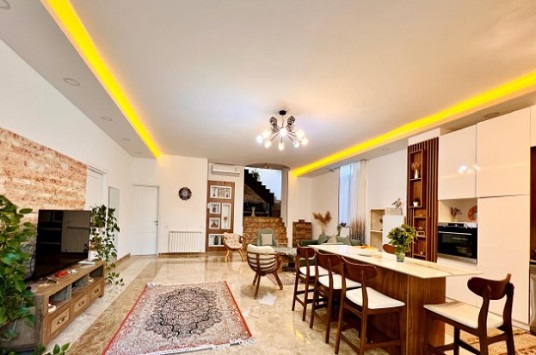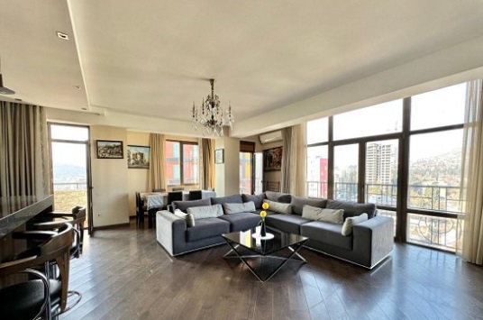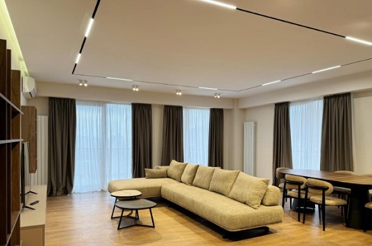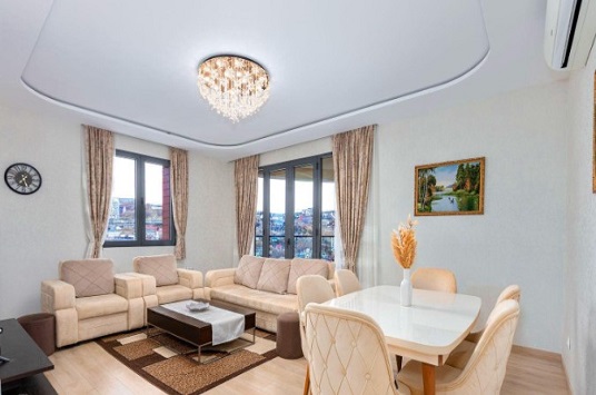 Furnished 1-bed, 1-bath 102 m² apartment in elite building with secure parking, quiet views, A/C, heated floors, and modern designer finishes.